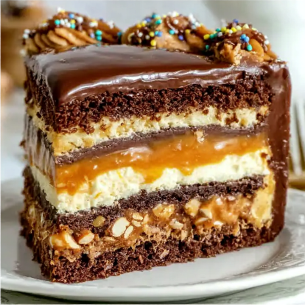 This cake is perfect for special occasions or a sweet treat to enjoy with friends and family. Each slice reveals layers of chocolate goodness that harmonize beautifully with the crunchy and chewy textures that you've come to love in a Snickers bar.