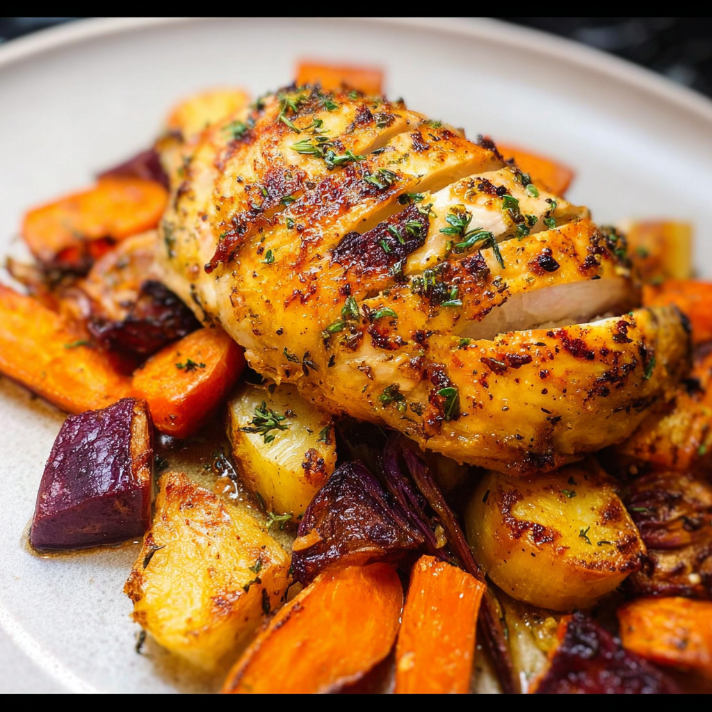 Roast chicken with root vegetables is a classic dish that brings warmth and comfort to any table. With its enticing aromas and colorful presentation, it is perfect for family dinners or festive gatherings. The harmonizing flavors of tender chicken alongside earthy vegetables create a satisfying meal that feels both rustic and refined.